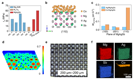 图4 (a-d) Co/MgAgSb界面剪切强度及结合能计算;(e, f)带阻挡层材料的微粒子切割实验照片。
