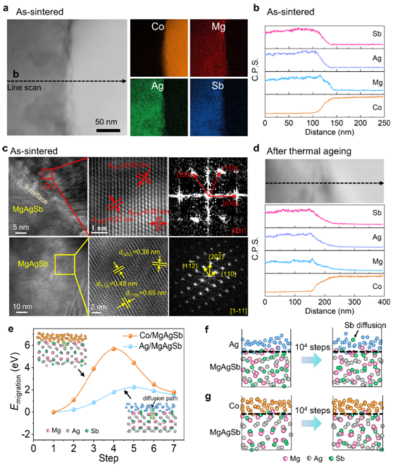 图3 (a-d)Co/MgAgSb元件老化前后的界面表征; (e, f) Ag和Co作为阻挡层的分子动力学模拟。