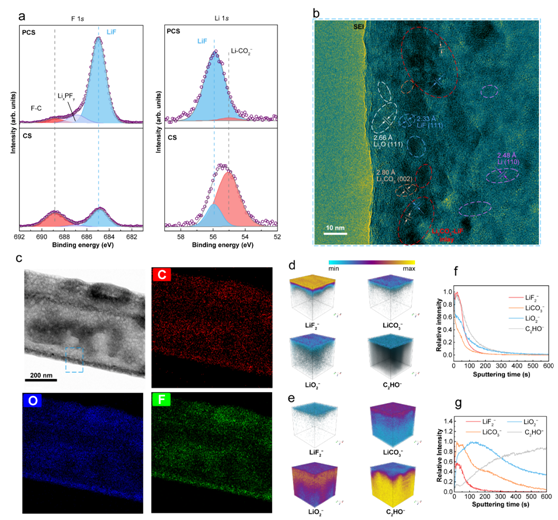 利用冷冻电镜(cryo-TEM)在亚埃级分辨率下,分别研究了高介电常数与低介电常数隔膜存在时电化学沉积形成的SEI结构。发现了Li2O、Li2CO3和LiF组分。当存在高介电常数PCS隔膜时,观察到SEI呈现镶嵌结构,大量LiF嵌入Li2CO3基体中。这种镶嵌结构能在保持LiF低电子电导率的同时促进锂离子传输。相反,采用低介电常数隔膜时几乎观察不到LiF,SEI结构以非晶态为主。冷冻电镜元素分布图显示C、O、F元素的分布特征,证实了SEI界面处LiF的富集现象。上述结果证实高介电常数PCS隔膜能在电场驱动下辅助形成低能垒的坚固SEI,其中锂离子主要沿晶界扩散,其速率显著快于传统晶格扩散。TOF-SIMS和XPS的结果与冷冻透射电镜结果一致。