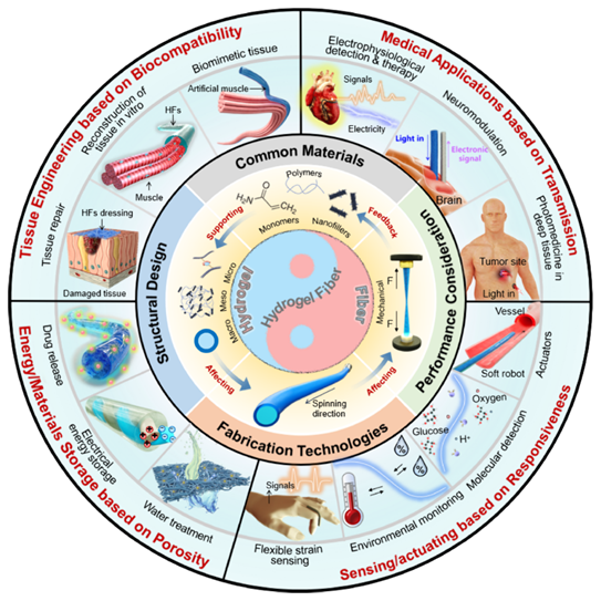 图2. 水凝胶纤维从设计、合成到应用的概述图