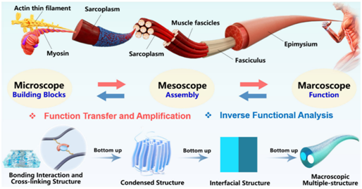 水凝胶纤维是一种结合了水凝胶材料的柔软性、湿润性、生物相容性和环境响应性,以及纤维材料的高长径比、各向异性和柔韧性的材料。这种材料因其独特的结构和功能特性,在生物医学、能源、环境科学等领域具有广泛的应用潜力。在自然界中,生物体内存在各种各样的水凝胶纤维,例如肌肉组织、神经组织和结缔组织。这些组织表现出特殊的功能和多级结构,承载着生命活动的奥秘和潜能。从体内的纤维组织,如神经和肌肉,到体外的各种动物毛发,这些水凝胶纤维不仅促进体内生物信号的传递,促进细胞分化等功能,而且可对外部威胁提供保护和防御。因此,理解和模拟生物体中有序的纳米复合材料结构和多层次组织是水凝胶纤维发展的重点和挑战。据此,该文章系统回顾水凝胶纤维的研究进展,内容涵盖了水凝胶纤维在原料选择、结构设计、纤维成形、性能评估、功能应用以及未来展望等多个方面(图2),为未来的研究提供指导,推动水凝胶纤维在多个领域的应用和发展。