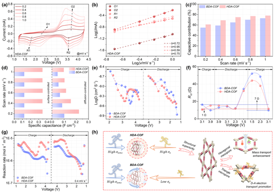 通过异孔D-A工程,HDA-COF在高质量负载下显著提升了电子和离子传输性能(图6)。其表面控制电容占比达78%,高于BDA-COF(73%),且离子扩散系数(~7.9×10−10 cm2 s−1)与电荷转移速率(反应速率~4.1×10−6 mol s−1 m−2)均优于对比材料。更低的电荷转移电阻(44 Ω)和活化能(0.50 eV)表明异孔结构有效促进了电解液渗透和活性位点利用,协同增强了表面控制与扩散控制电容,实现了电子传输与离子扩散的高效匹配。