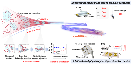 图3 剪切增强杂化技术实现高性能共轭聚合物纤维及纤维有机电化学晶体管制备