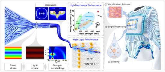 在“可纺”的材料与成形层面,研究团队提出“剪切增强液晶纺丝”新策略:在微流控喷丝区施加可控剪切诱导各向异性液晶相,并在凝固过程中“锁定”分子取向与晶序,从而制备出兼具高取向、高结晶度与高电化学性能的一体化半导体纤维(以BBL为代表)。所得纤维表现出约15.3 GPa的杨氏模量和约600 MPa的抗拉强度,并在极端温度、强紫外和强酸碱/有机溶剂环境下保持稳定;基于该纤维构建的OECT在轴向方向的迁移率与跨导显著优于径向,>10,000次门脉冲循环仍稳定工作。进一步,团队在织物平台上完成了对汗液离子与葡萄糖的逻辑判别,并联合电致变色纤维实现“感知—决策—显示”的可视化健康监测示范,相关成果发表于National Science Review[1]。